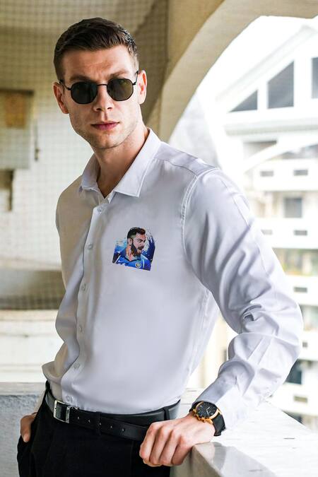 White shirt featuring a hand-painted detail of cricket legend Virat Kohli