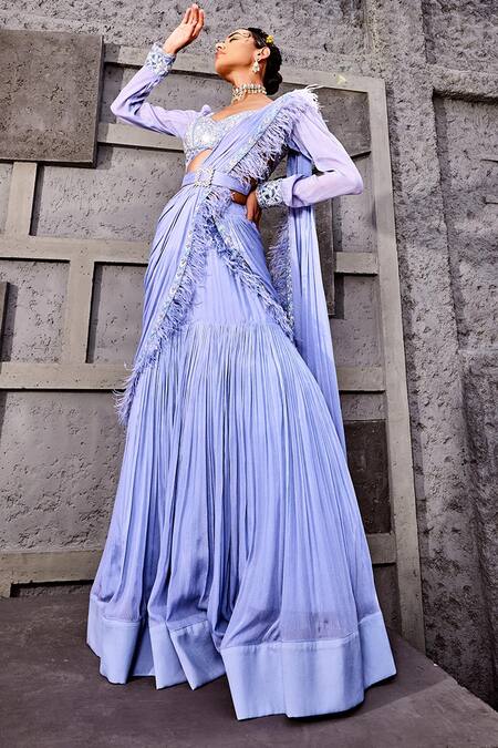 Cobalt blue pre-draped saree featuring floral embroidery and feather trim on the pallu border. Includes a padded floral embroidered sweetheart neckline blouse and a crystal embellished belt.