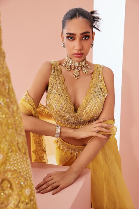 Yellow bustier embellished with cutdana, pearl, and sequin details. Paired with an asymmetric embroidered organza cape and satin georgette dhoti skirt.