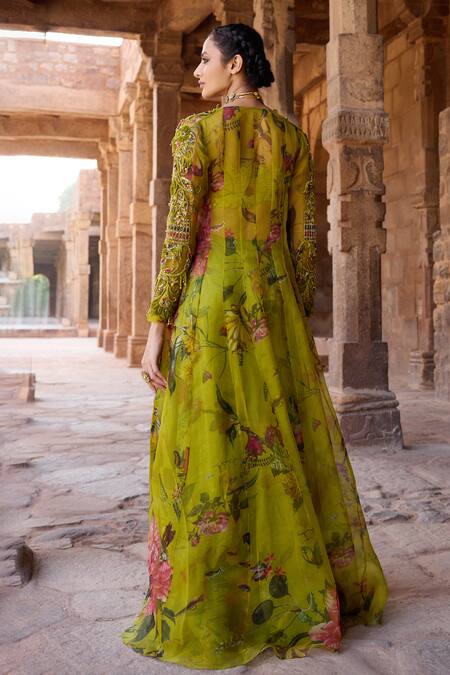 Green organza kurta set featuring a blouse, jacket, and flared pant. The set is adorned with intricate embellishments and floral patterns.