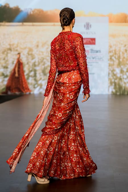 Red pre-draped saree made from satin georgette featuring an all-over Rafflesia garden print. Paired with a matching bustier and a sequin-embellished crop jacket.