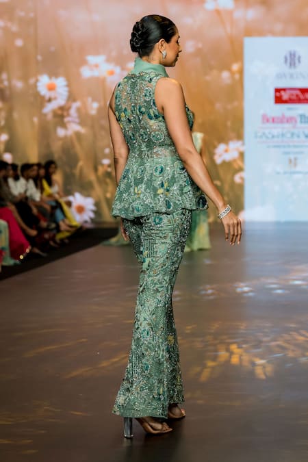Buy_Awigna_Green Organza, Net Fabric Flowers, Elara Wonderland Garden Peplum Top With Pant_at_Aza_Fashions