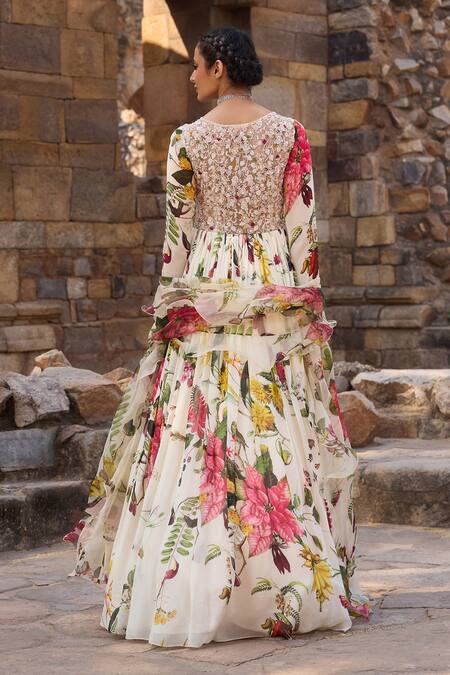 Ivory Anarkali featuring floral embroidery and a deep V-neckline. Paired with a matching floral printed dupatta.