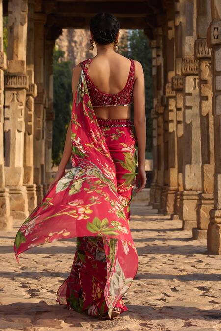 Fuchsia pre-draped saree featuring vibrant floral prints and intricate embellishments. Paired with a matching embellished blouse for a complete look.