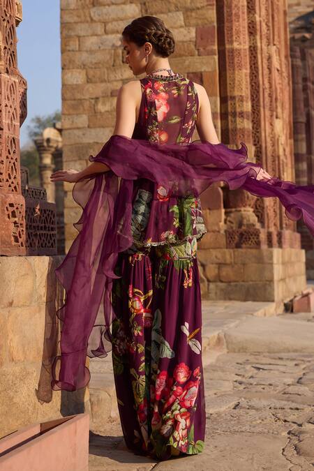Purple floral printed tunic featuring a deep neckline and embellished front. Paired with a matching sharara and a sheer dupatta.