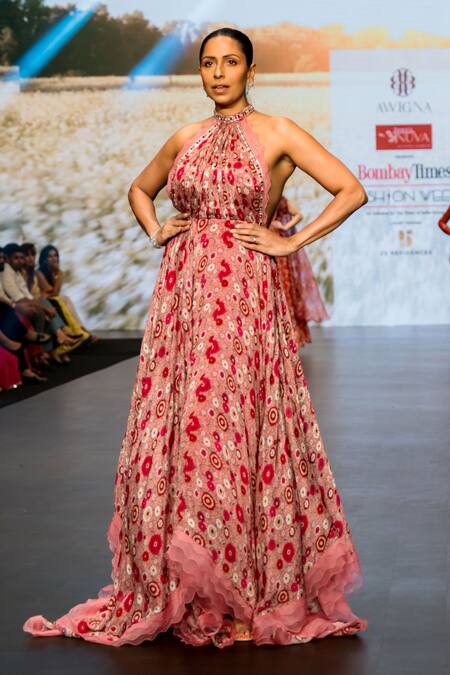 Buy_Awigna_Pink Organza, Chiffon Embroidery, Lace Halter Kendal Rafflesia Bloom Print Gown_at_Aza_Fashions