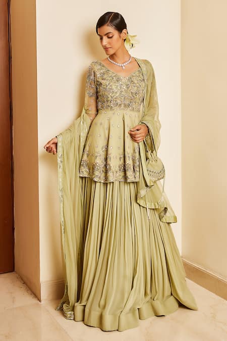 Green Crepe Lining, Dupatta- Net, Peplum- Organza, Liana Pleated Lehenga Set