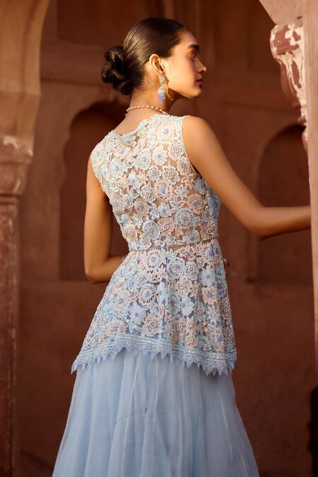 Blue Net, , Silk Sequins, Magnolia Peplum Blouse Lehenga Set