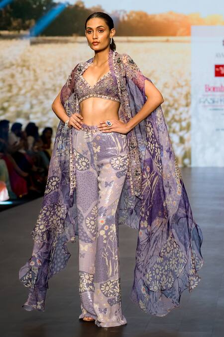 Purple cape featuring floral print, sequin embellishments & scallop edges. Paired with an embroidered bustier and printed sequined pant.