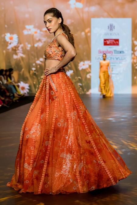 Buy_Awigna_Orange Organza, Net Embroidery, Orchid Floral Print Lehenga With Bustier_at_Aza_Fashions