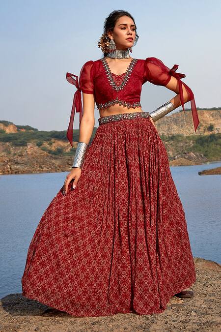 Red lehenga with all-over printed motifs & gathered details. Paired with organza blouse with tie-up details on sleeves. Comes with a soft net dupatta & embroidered belt.