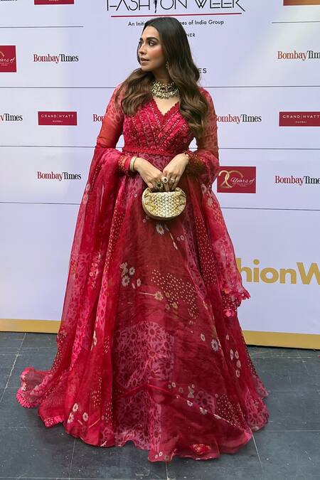 Red anarkali featuring floral print with embroidered yoke. Paired with a printed dupatta.