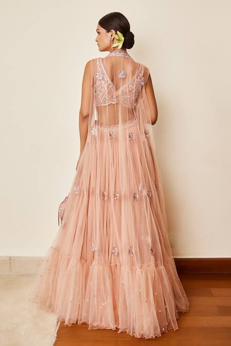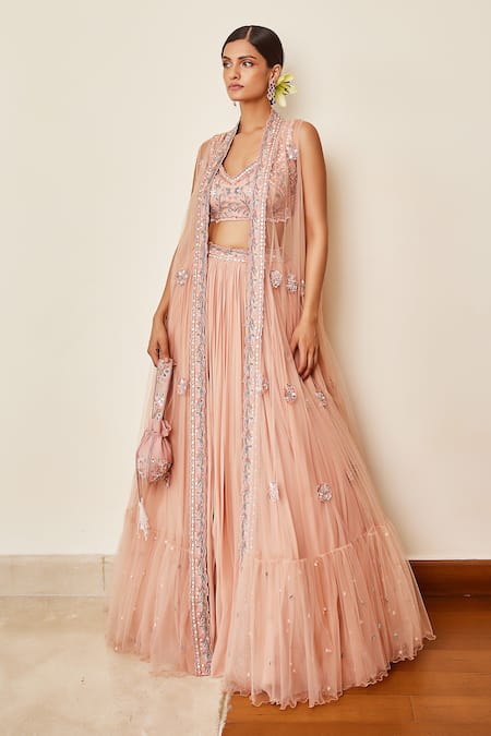 Peach cape with resham, cutdana, mirror embroidery. Paired with blouse & lehenga.