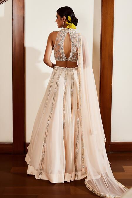 Ivory lehenga with cutdana, sequin, mirror, bead embroidery. Paired with blouse & dupatta.