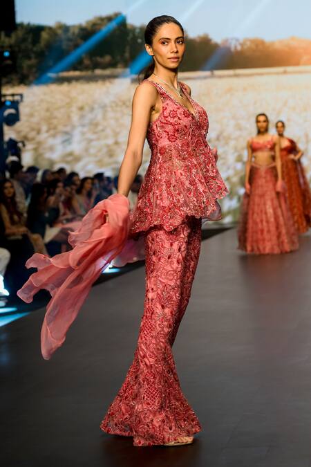 Pink peplum top featuring a V neck and heavy floral embroidery. Paired with embroidered pants and a ruffled dupatta.