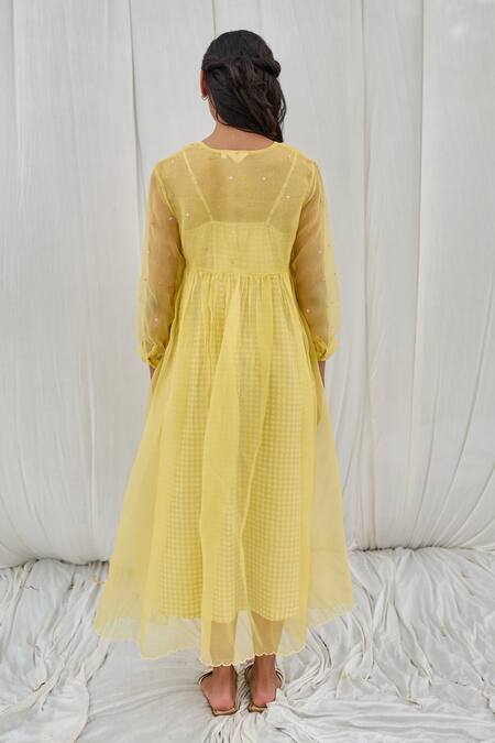 Neon yellow midi dress featuring multicolor floral hand embroidery and checkered print inner. Designed with a V neck and three-quarter sleeves, it includes tassel detailing and button placket embellishments.