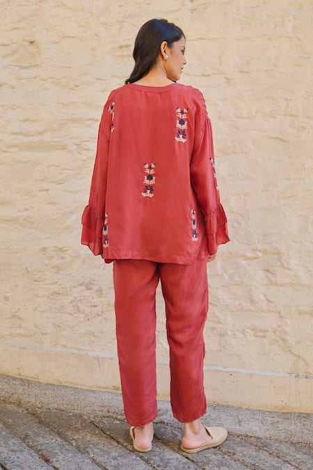 Brick red top featuring a V neck, front buttons, and circular flounce sleeves. Embellished with contrast hand embroidered floral buttis and comes with a separate inner.
