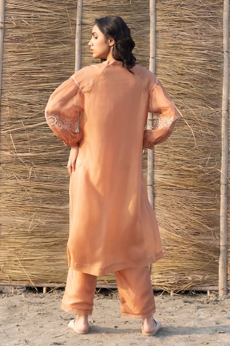 Brown tunic featuring a front button-down closure with hand embroidered silk organza sleeves