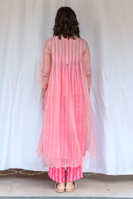 Pink silk organza dress featuring floral and thread hand embroidery with box-pleats. Paired with a viscose tabby striped inner.