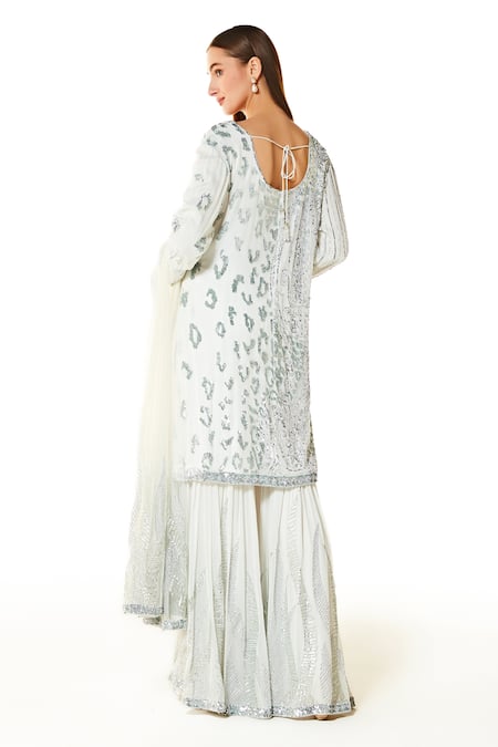 Off white kurta featuring hand embroidered sequins and cutdana work. Paired with an embroidered gharara and a net stole.
