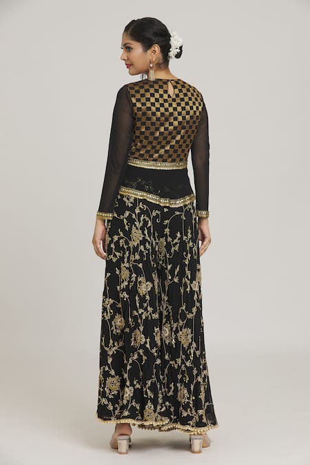 Black Cotton, Georgette Tassels, Embroidery Round Floral Kurta Flared Pant Set