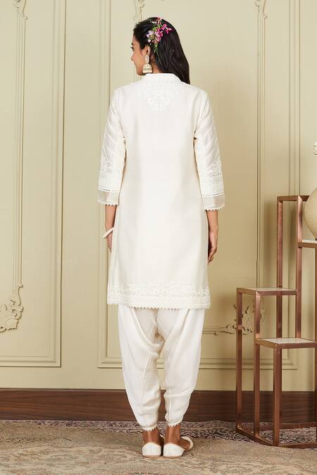 White Silk Chanderi Dhoti Pant Bamberg Satin Dori Work Ayika Kurta And Set