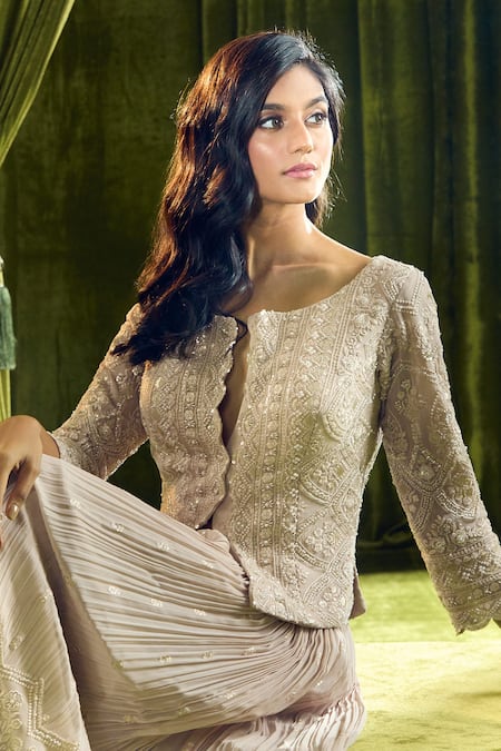 Beige hand embroidered jacket featuring pearl, sequin, thread, and bead work. Paired with a coordinating sharara designed in georgette fabric.