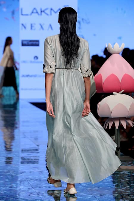 Blue Silkmul And Chanderi Thread Round Azara Kurta With Jogger Pants