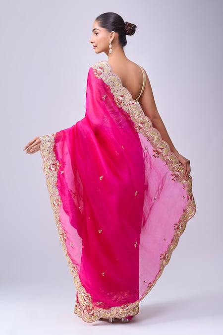 A fuchsia pink saree featuring intricate embroidery along the scalloped border and scattered motifs on the body. It comes with an unstitched blouse piece.