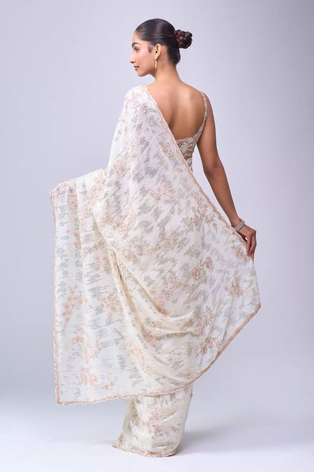 Ivory Embroidery, Sequins, Zari Floral Saree With Unstitched Blouse Piece