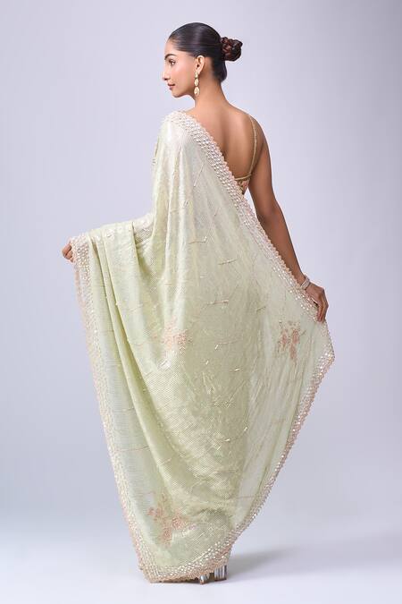 This mint green saree features all-over sequin embroidery and delicate pink threadwork on the borders. It is accompanied by an unstitched blouse piece.
