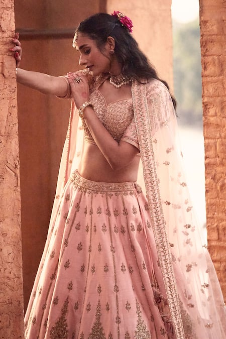 Coral pink lehenga featuring floral zardozi work embroidery and sequins. Paired with a padded embroidered blouse and matching sheer dupatta with ornamented tassel details.