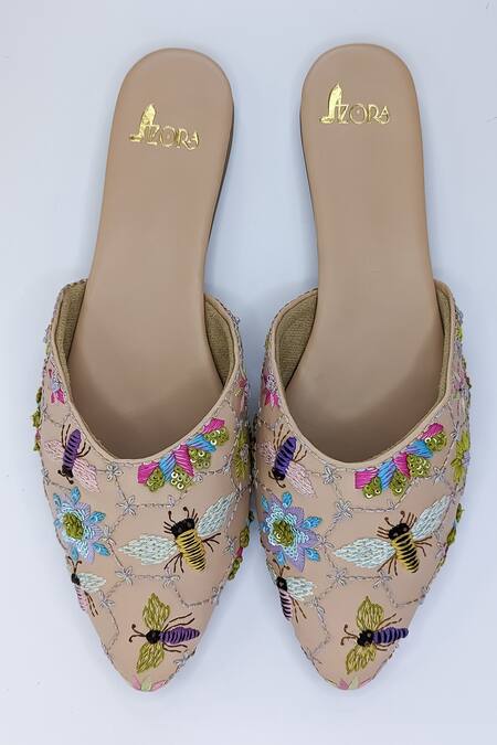 Beige mules featuring a pointed front design and all-over floral and bee pattern