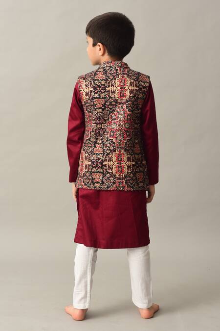 Multi color georgette bundi with abstract print, thread & sequin work. Paired with dark red cotton satin mandarin collar kurta & off white pants.