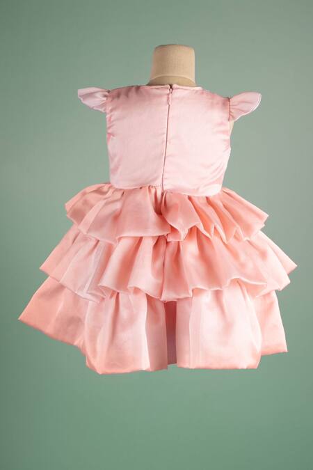 Pink cap sleeves tulip layered dress in satin art organza base with scattered pearls embroidered yoke. Paired with a hand embroidered bow hair clip.