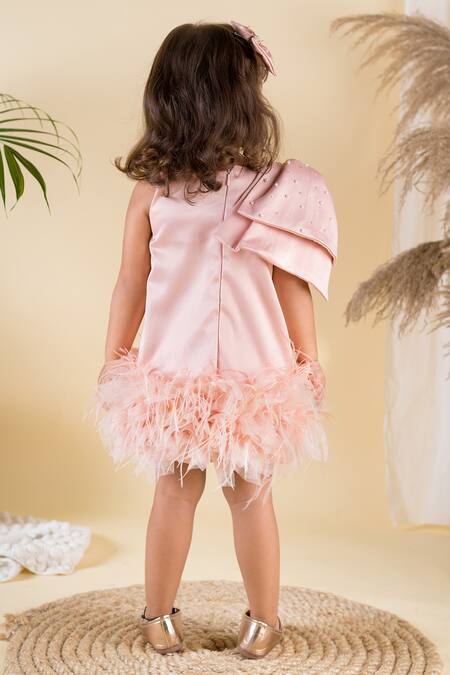 Soft pink heavy satin & soft net dress with a feathered hem and an attached pearl hand embroidered one-shoulder big bow. Comes with a hair accessory.