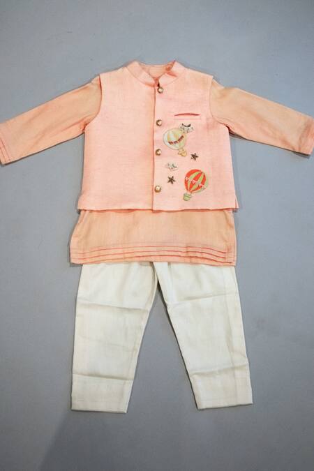 Soft pink satin blend bundi featuring hand embroidered hot air balloons and rainbow motifs. Paired with a cotton satin full sleeves kurta and off white pants.