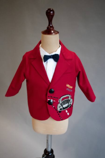 Red suiting fabric double breasted blazer with pure cotton lining, notched lapel collar, embroidered placement car theme motif in thread & bead work. Paired with white cotton shirt with black attached bow-tie.