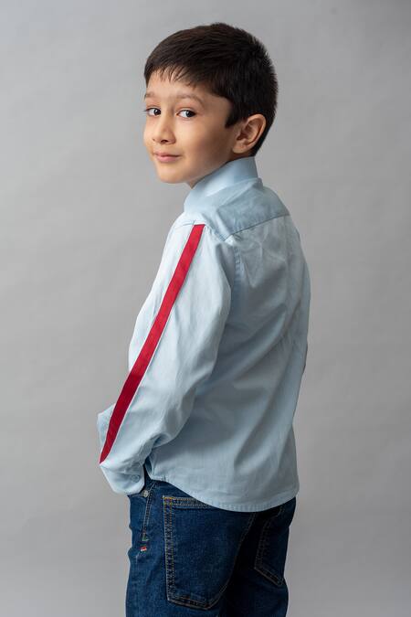 Pastel blue cotton shirt with curved collar, red stripe highlights on sleeves, embroidered placement car theme motifs in thread & bead work.