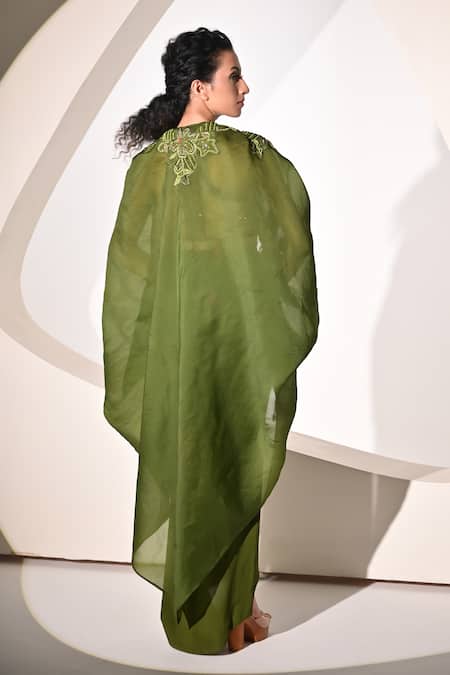Green Crepe, Organza Sequins, Beads, Applique Embellished Cape Slit Skirt Set