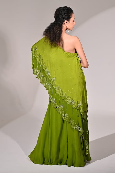 Green ombre layered cape style tunic featuring one shoulder design with embellished bead-sequin floral motifs and tassels. Paired with a matching sharara for a coordinated look.