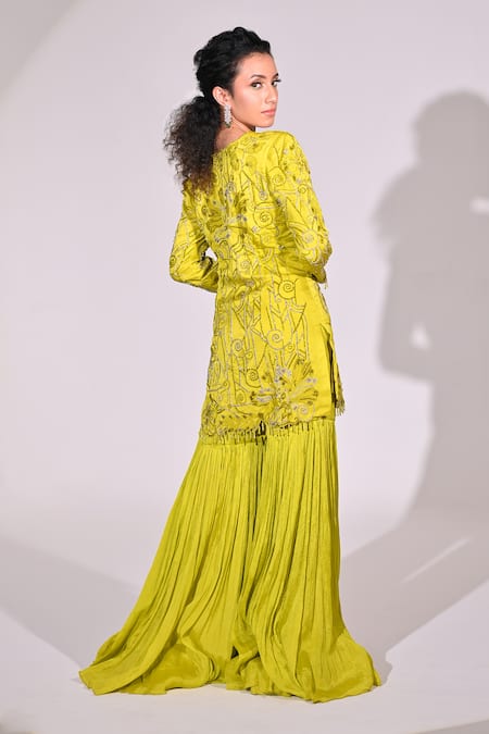 Buy_BAANI KHURANA_Green Organza, Chiffon Sequins, Beads, Applique, Floral Vine Kurta Sharara Set _Online_at_Aza_Fashions
