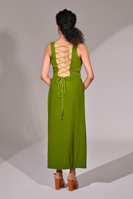 Green Crepe Beads, Sequins Sweetheart Neck Vine Embellished High-low Tunic