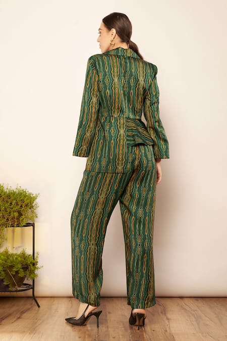 Green Silk Abstract Ripple Print Asymmetric Blazer Top