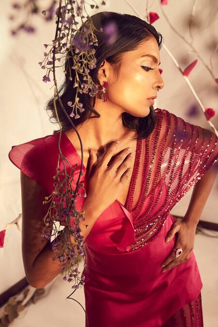 Buy_Babita Malkani_Pink Organza, Tulle, Silk Satin Embroidery Round Neck Draped Jumpsuit