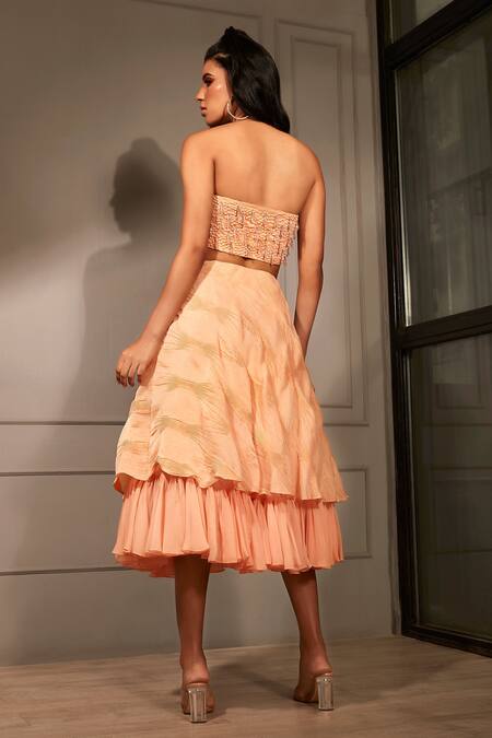 Peach layered skirt in semi pleated fabric with gathered bottom. Paired with strapless embroidered crop top.