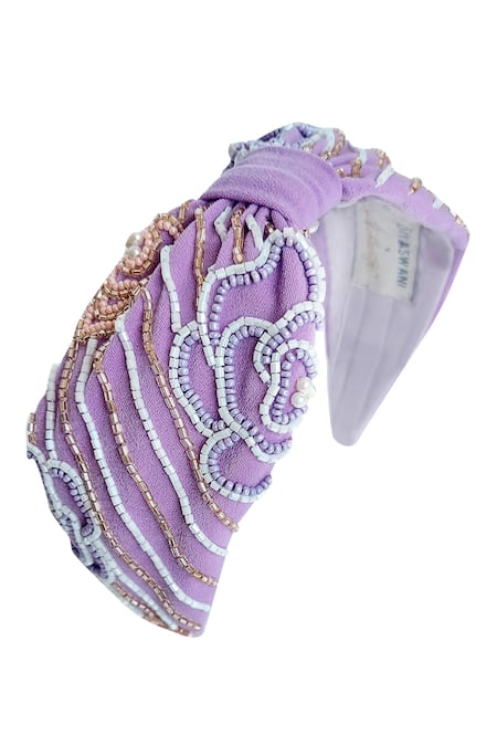 Purple turban-style headband featuring floral motifs with multi-color embellished beads and sequins