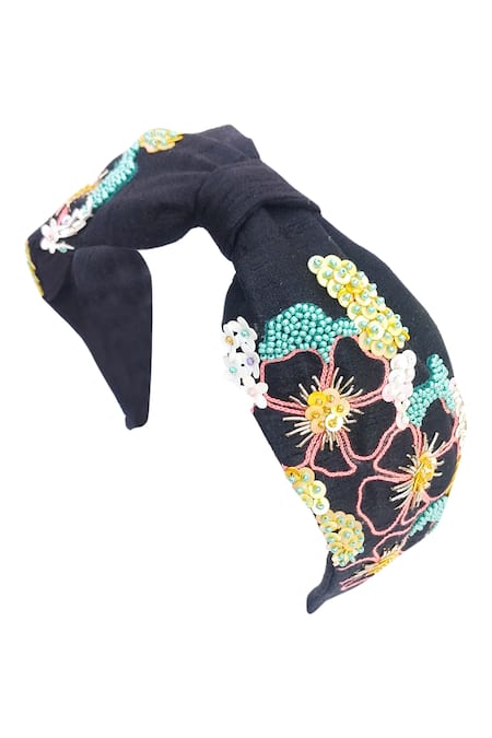 Black turban-style headband featuring multi-color floral motif embellished with sequin-bead and thread work