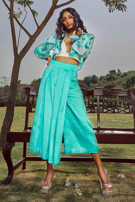 Celestial blue overlap-style cropped pants with pleated overlay. Comes with placement sequin worked tie-dyed jacket & contrast crop top.