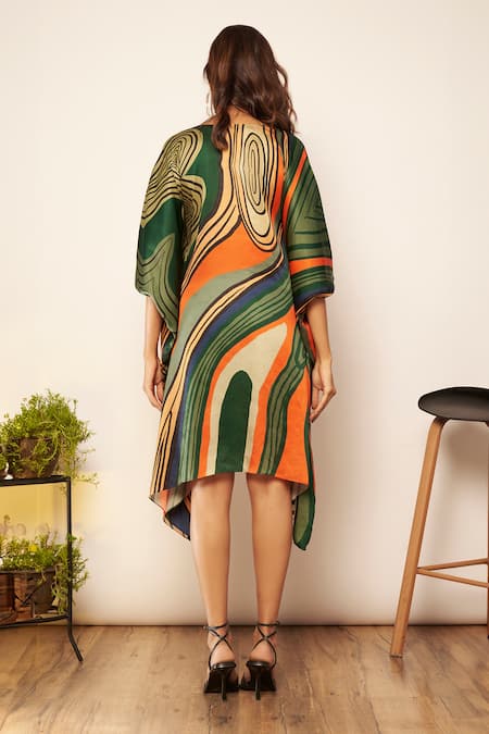 Green & orange batwing sleeves short kaftan featuring an all-over popple wave print with hand embellishments detailing